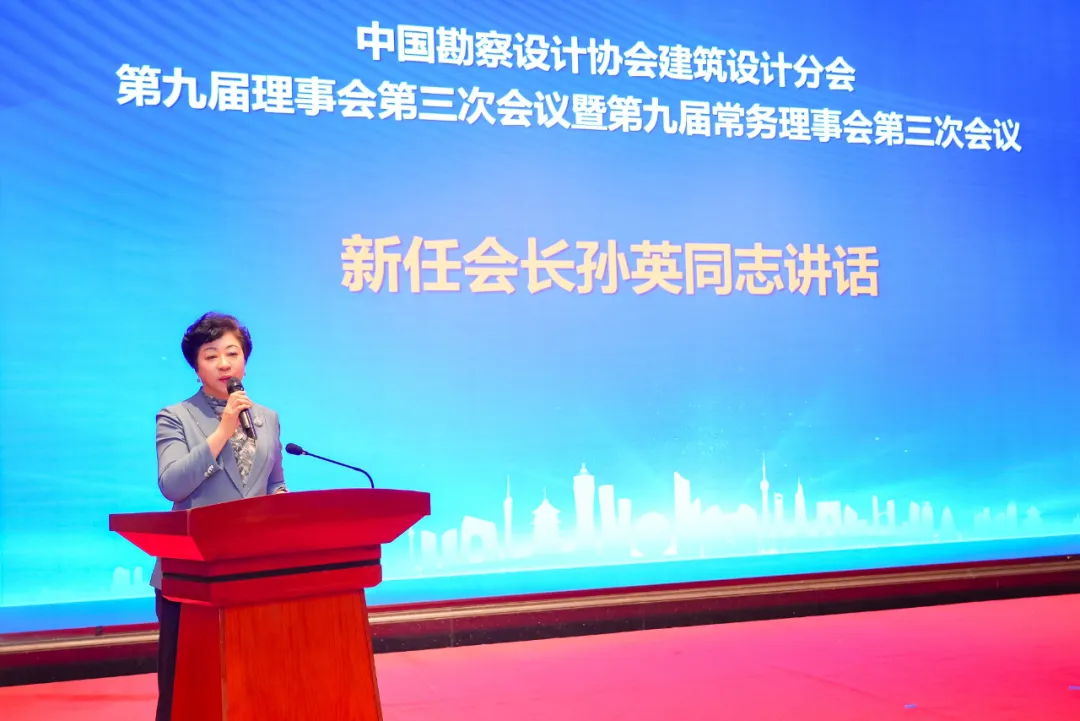 孙英作为建筑设计分会新任会长发表讲话。她对中国勘察设计协会、建筑设计分会全体理事、会员的支持和信任表示感谢,对文兵为建筑设计分会发展作出的突出贡献致以由衷的敬意,并表示,担任第九届理事会会长深感使命光荣、责任重大,将不负信任与重托,紧密团结广大会员单位,凝聚行业合力,与理事会同仁共同锐意开拓进取,扎实履职尽责,携手全行业为建筑设计行业高质量发展注入强大动力。